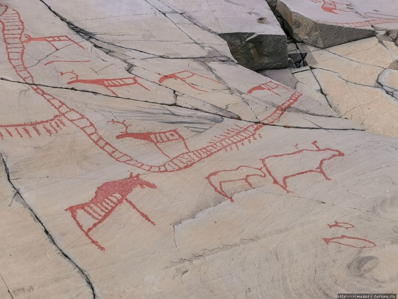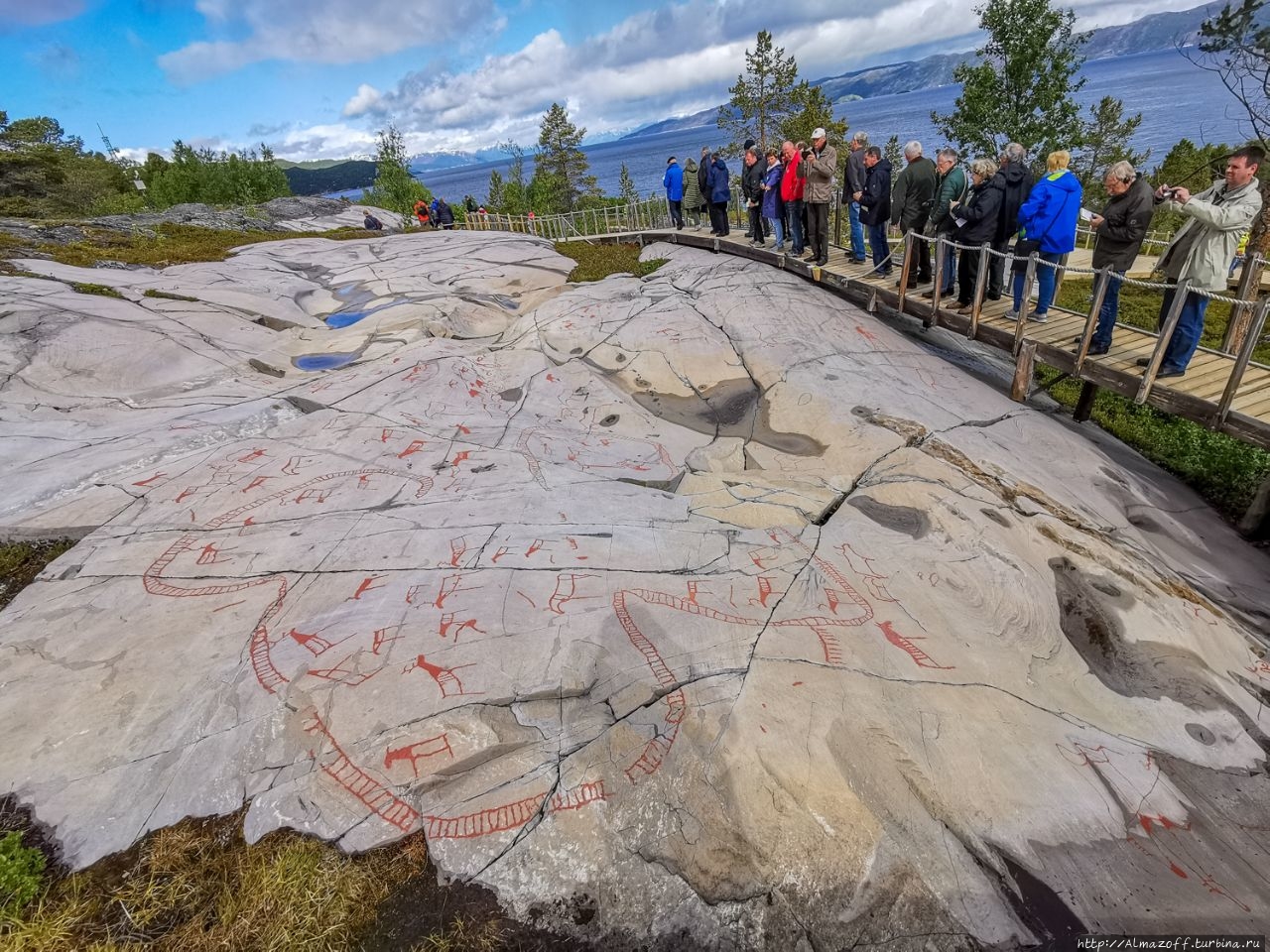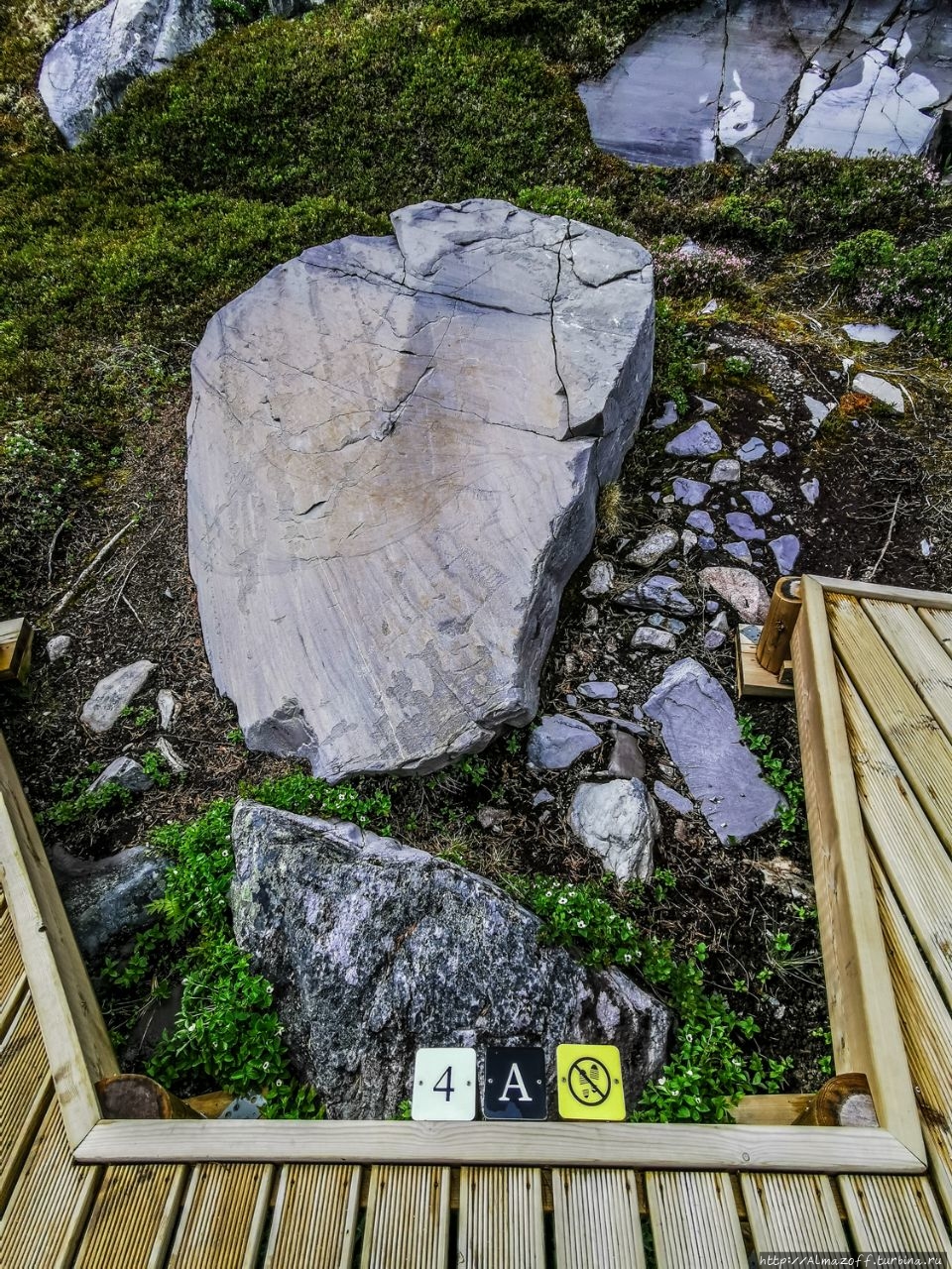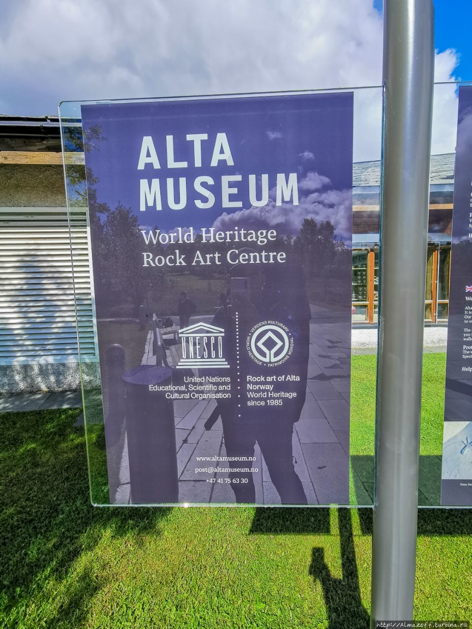 "Эта группа петроглифов в Алта-фьорде, близ Северного полярного круга, является следами, оставшимися от поселения, существовавшего здесь в период 4200-500 лет до н.э. Тысячи росписей и рельефов существенно облегчают нам понимание того, какими были среда обитания и деятельность человека на Крайнем Севере в доисторические времена."