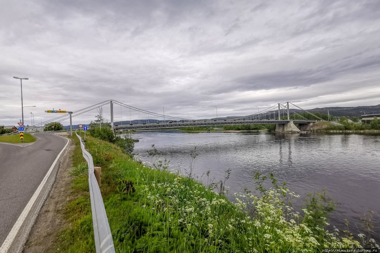 Главная церковь города Хаммерфест в Северной НорвегииПервая машина меня довезла до Скайди, а вторая повезла до города Алта, на юг. Не знаю почему, но я попросил меня высадить на въезде в город у моста через реку Алтаэльв. Вот реально не понял свой мотив. Водитель явно ехал в центр города...