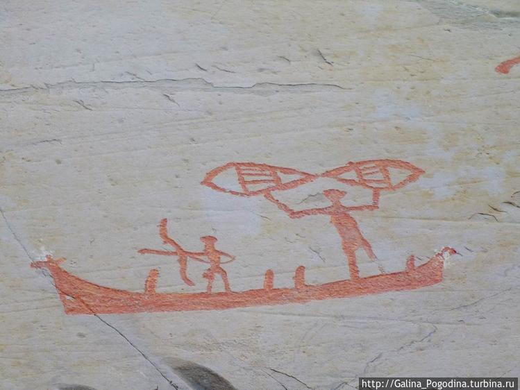 Это самые поздние изображения, им 2000 лет, и в их обычную тематику врывается новая деталь. Вместо кожаных рыбацких лодок мы видим огромные дракары викингов по 30 весел на борту. Норманны никогда не ладили с аборигенами — эскимосов и индейцев они называли "скрэлинги", при встречах старались их прикончить. Аборигены отвечали взаимностью. В результате норманны так и не смогли закрепиться в Америке. Рисунки дракаров одни из последних — скорее всего, аборигенам пришлось уходить под давлением пришельцев. Но вот самые ранние походы викингов датируются не 2000 годами ранее, а максимум 1700, и то на Черном и Средиземном морях в альянсе с боранами — славянами. Видимо, мы чего-то не знаем.