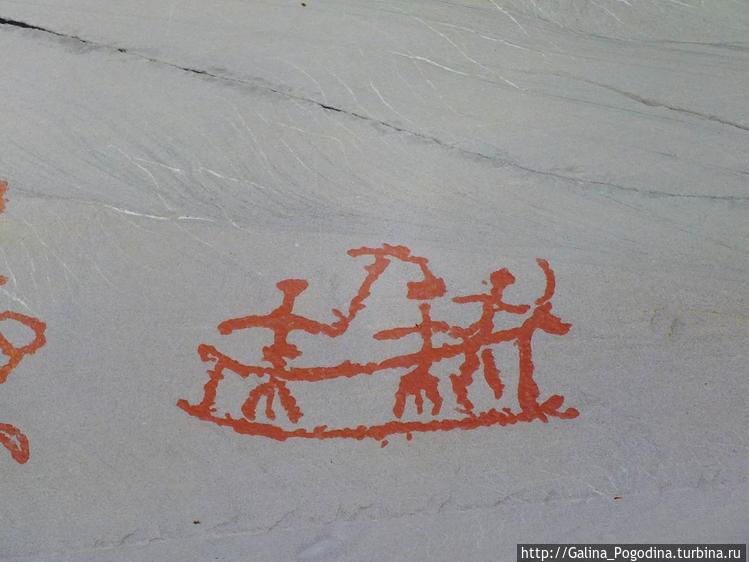 Это рыбная ловля. Что за конструкция в руках человека, экскурсовод не знала, но мне сказали что это верша. Нос и корма лодки украшены головами животных. Интересно, что у викингов нос кнорра (торгового судна) украшался резной головой теленка или другого мирного животного, а нос военного дракара — соответственно головой дракона. Но здесь жили явно не викинги.