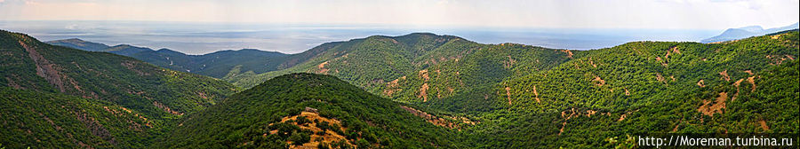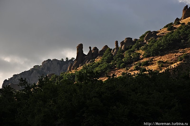 Погода стала резко ухудшаться, поднялся ветер, стало ещё холоднее и в придачу нас стало поливать с неба водой, холодной такой. Настроение опустилось ниже некуда. По моим подсчётам, нам до верха Южной Демерджи оставалась совсем малость и тут вдруг нам навстречу бегут в куртках молодая пара. И мы побежали за ними, оказалось у них стоянка на кордоне. Там на этом кордоне, мы поели, слегка обсохли, стали расспрашивать лесника как и что, когда я пояснил что у нас возле "Дачь" на Сотере стоит авто, лесник сильно удивился и спросил, вы сто с Сотеры сюда пришли?! Мы сразу не поняли его восклицания. Оказалось что нормальные люди таким маршрутом не ходят на Демерджи. Посоветовал двигаться обратно по "Коровьей" тропе к Лучистому. Так мы и сделали. Пока мы шли в Лучистое мы увидели в стороне долину Приведений.