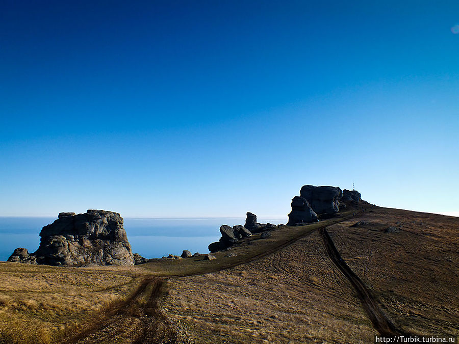 Маршрут заранее не продумывали, хотя и было всё для этого. Начали подъём из Лучистого по тропкам к ближайшим видимым каменным бабуйням на южном склоне, практически напрямик. Изначально нас было семеро, но дойдя только до первых изваяний, трое из нас решили возвращаться, аргументировав это непомерными нагрузками, избытком эмоций от уже увиденного и тем, что забыли полить цветы и выключить утюг. Ну а мы, оставшиеся, продолжили блуждание по склону и, дойдя до так называемой "солнечной поляны", пройдя немного в обратную сторону и обогнув скалы во главе с Хой-Кая (Голова Екатерины), по хорошей тропинке уже с востока вышли к вершине Южной Демерджи. Ну а затем по дороге к Северной Демерджи дотопали до Демерджийского перевала, откуда и спустились в Лаванду.