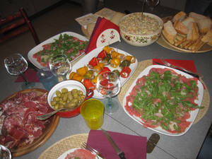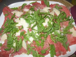Главный ингридиент - хорошее мясо. Оно очень тонко режется, покрывается пармезаном и рукколой, чем-то еще поливается (не помню, маслом или лимоном или и тем, и тем?) и съедается. Без соли, без термообработки. Мне понравилось, но все равно с кусочком жареной грудинки это не сравнить. И ощущение того, что я ем сырое мясо, тоже мешало, конечно же.