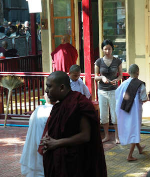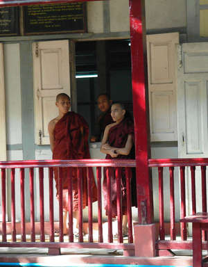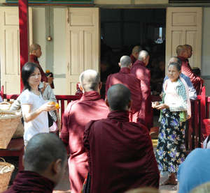 У моста "Накормить монаха — все равно, что накормить сто собак" — такова народная мьянмарская мудрость. Монахи в Мьянме — до недавнего времени практически неприкосновенные люди, и несмотря на то, что не так давно военная хунта нарушила это правило, тем не менее, монахов очень чтят, к их мнению прислушиваются, да и практически каждый мальчик и многие девочки "призываются" в нежном и не очень возрасте к проживанию в монастыре — духовностью и верой мьянмарское общество проникнуто полностью. Живут монастыри на пожертвования, а кормление монахов превращается в определенного вида церемонию, когда спонсоры берут на попечение на какой-то период времени монастырь и организовывают там трапезу. Деньгами помогать не положено — в принципе, монах даже не должен прикасаться к деньгам (ЗАО "РПЦ", где вы? ), грех это для него, поэтому регулярно можно увидеть монахов с большими горшками-котелками, бродящими по населенным пунктам и — нет, не спрашивают еду, они просто ходят с открытыми котелками или стоят себе, а кто захочет — сам бросит или горсть риса, или яблоко, или горсть орехов, или меда. При этом монахам даже не положено смотреть на дающего — взгляд уставлен чисто на котелок.