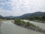 Для начала немного снимков с берега реки Риони, их я сделал перед выездом в город Они. Домик странно синим цветом оформили Парк для детей, посетителей не видно Странный камень Красивое новое здание…