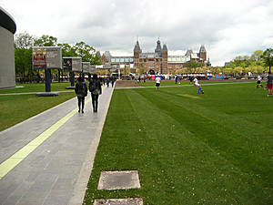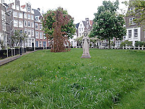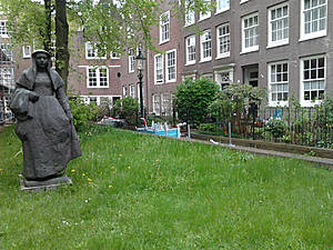 С зеленью в Амстердаме напряженка. Как впрочем и в других городах Нидерландов. Нам известны только 2 столичных парка: Hortus Botanicus и Vondelpark, но они совсем не в центре. Не часто можно увидеть даже зеленые лужайки, как например перед музеем Ван Гога. Вдоль каналов как правило растут деревья, да только в один ряд, что и на аллею то не тянет. Таков голландский стиль: мы, туристы, видим лишь нарядные фасады домов с подвешенными к окнам в кашпо цветочными горшками и гуляем по плиточным тротуарам. А свое "домашнее" голландцы прячут во дворах. И если суметь проникнуть через дверь какого-нибудь жилого дома в его внутренний дворик, то здесь и можно увидеть зеленые лужайки, цветущие деревья и яркие клумбы