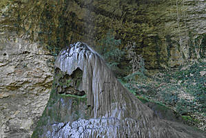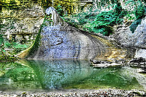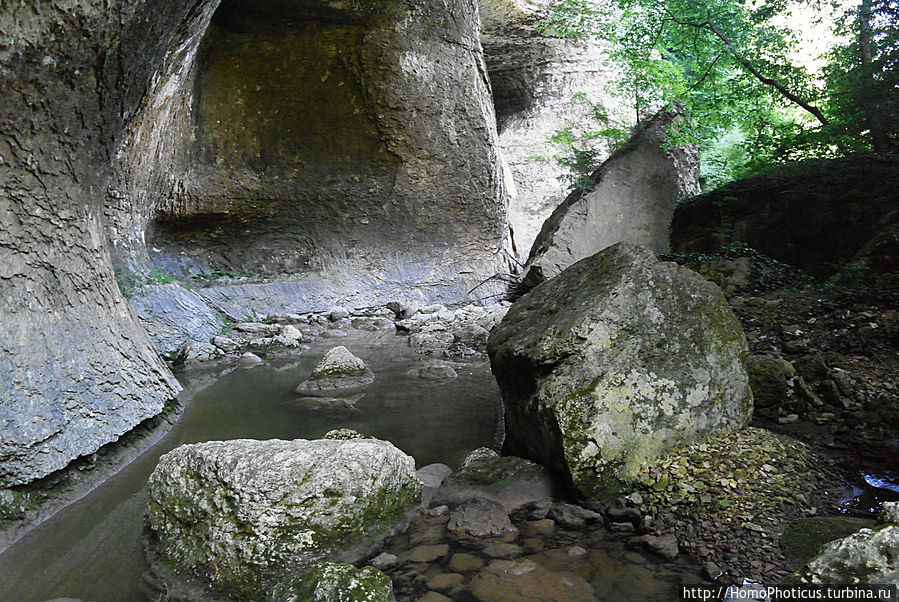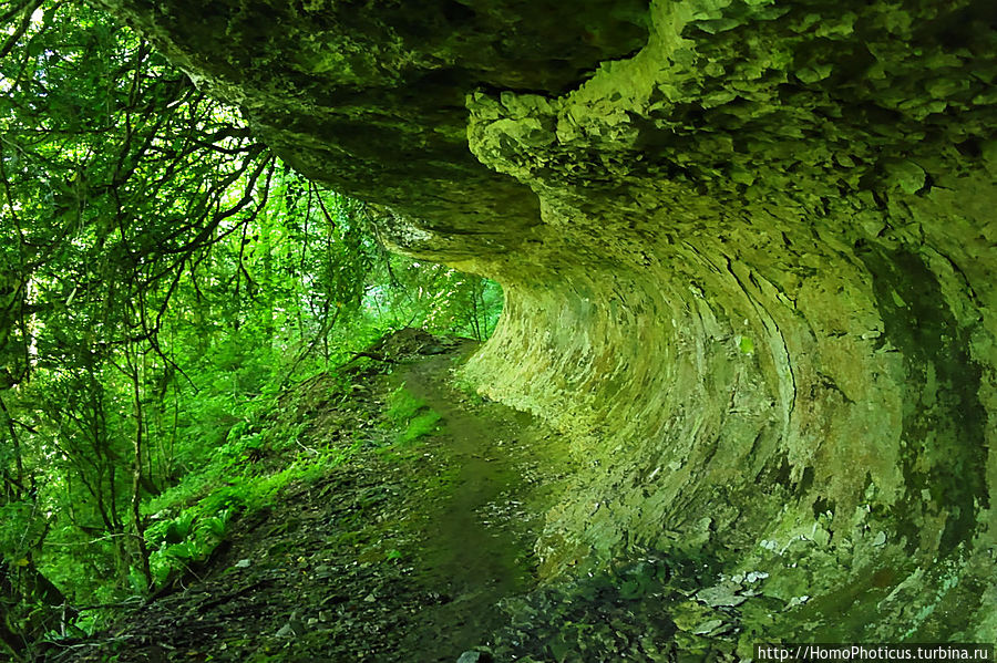 Теперь немного об ощущениях. В принципе, я бы подготовлен предыдущими пещерами, но эта — превзошла все. Опять же, попадаешь в ущелье через незаметную расщелину, и оказываешься моментально в сказочном дремучем лесу полностью заросших мхом самшитом, а сверху нависает каменный свод. Игра света меняется в зависимости от его яркости где-то там, над головой, в другом мире, а влажность зашкаливает — такое впечатление, что здесь всегда присутствует дымка, и даже нити паутины покрыты мелкими каплями. Кажется, что вот именно в такое лесу "чудеса, там леший бродит, русалка на ветвях сидит" и в любой момент может шлепнуться на голову:)