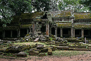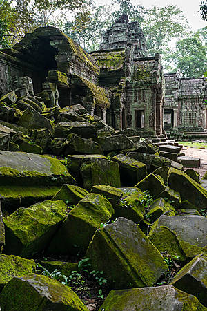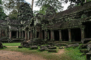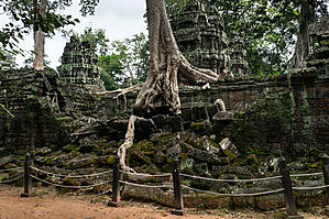 Та Пром получил широкую известность благодаря тому, что именно здесь снималась знаменитая кинолента про Лару Крофт с Анжелиной Джоли в главной роли. Из всех храмов древнего Ангкора был выбран именно Та Пром, вероятно, потому, что это один из немногих храмов здесь, который не очистили от джунглей. Перед нами он предстает именно в том виде, в каком в конце 19 века был обнаружен французскими путешественниками – руины с вросшими в них деревьями. Та Пром выглядит запущенным и забытым, но именно в этом его прелесть. Это, безусловно, самый завораживающий храм Ангкора. Сначала было решено очистить все от деревьев, так как они своими мощными корнями наносили вред строениям, разрушая их. Но позже очищение от джунглей было приостановлено, так как за годы эти удивительные деревья с корнями, похожими на мощных змей, настолько плотно в буквальном смысле срослись с сооружениями, что расчистка от джунглей, напротив, скорее бы погубила храм.