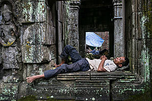 • У работников, восстанавливающих здешние постройки, тихий час. Спят кто где придется. Этот — на окне