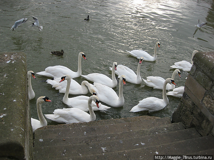 Мы с удовольствием поспешили примкнуть к кормящим и ничуть об этом не пожалели: один из лебедей вылез на набережную и начал важно прохаживаться между //желающими//его покормить.