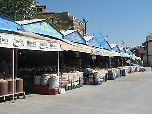 Сразу за воротами начинается открытая торговая площадь. Запахи пряностей здесь буквально преследуют тебя. Напротив ворот находится гостиница , построенная в 18 веке и служившая местом, где путники могли укрыться ночью от разбойников. Первая гостиница в Анкаре представляет собой каркасное строение, выложенное из высушенного на солнце кирпича. Она была гостиницей до 1921 года, пока военные не превратили ее в командный пункт. Сейчас, полностью отреставрированная она превращена в торговый центр.
