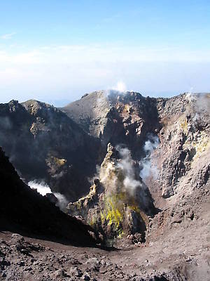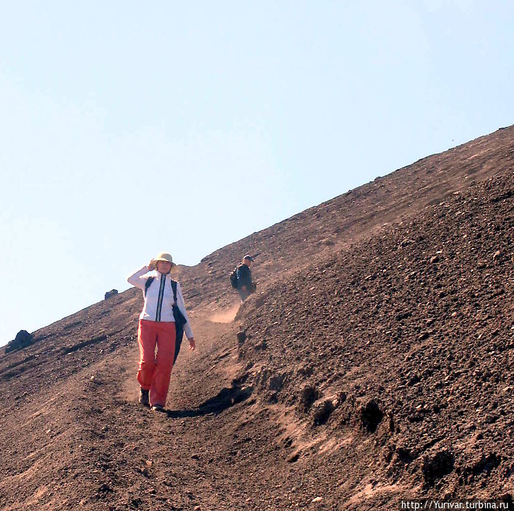 Ноги вязнут в сыпучей пемзе и двигаться довольно тяжело. Через час был достигнут гребень на верхней части вулкана и открылась грандиозная картина внутренностей его кратера.