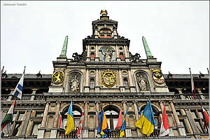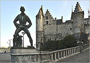 Антверпен, на самом деле, является одним из крупнейших портов мира и "морскими воротами" в Европу. С названием города связана целая легенда, связанная с рыцарем Брабо, статуя которого стоит у ратуши. Когда-то в этой местности жил великан Антигон. Злой монстр облагал пошлиной все проходившие по реке Шельда купеческие суда, а противившимся его воле — отрубал руки. И лишь храбрый римский рыцарь Брабо бросил вызов великану и одолел его. Он отрубил великану руку и бросил ее на берег реки. "Ханд верпен" — по-фламандски не что иное, как "бросать руку". Теперь ясно откуда появилось название города. А статую великана вы увидите на фото...