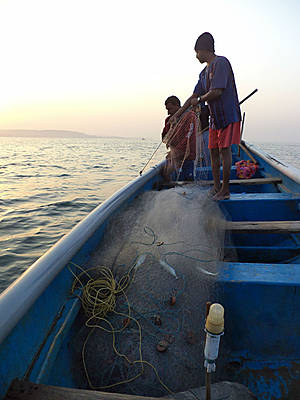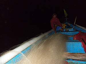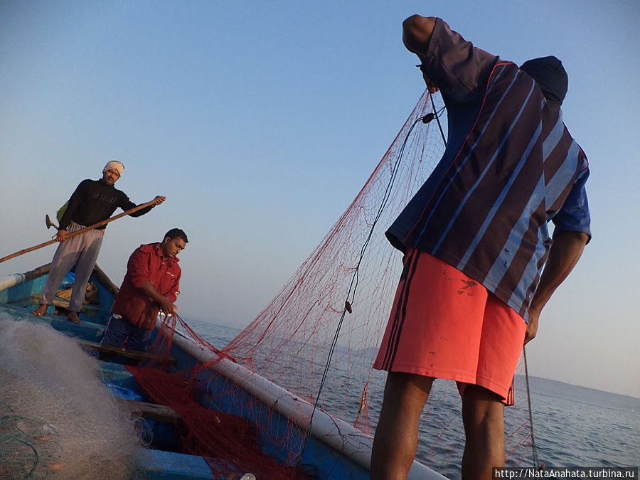 Саби велит мне запрыгивать в лодку. Рыбаки, сложив руки, тихонько читают молитву, и вскоре мы отчаливаем. Лодка моторная, но весла тоже при ней – они пригодятся чуть позже. Минут через пятнадцать Саби заглушает мотор, и вдвоем с напарником они начинают ставить сети. Третий берется за весло. Сначала выбрасывают «якорь», что-то тяжелое. Затем, по мере движения, разворачивают сеть, лежащую на дне лодки, и опускают ее в воду. Довольно-таки монотонная работа.