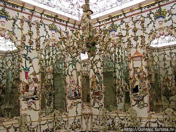 Второй кабинет был еще более неожиданной находкой среди в целом классических интерьеров. Это был китайский фарфоровый кабинет. На люстре и потолке здесь сидели попугаи и райские птицы, а обезьяны карабкались по фарфоровым лианам, поднимающимся к потолку по мраморным стенам.