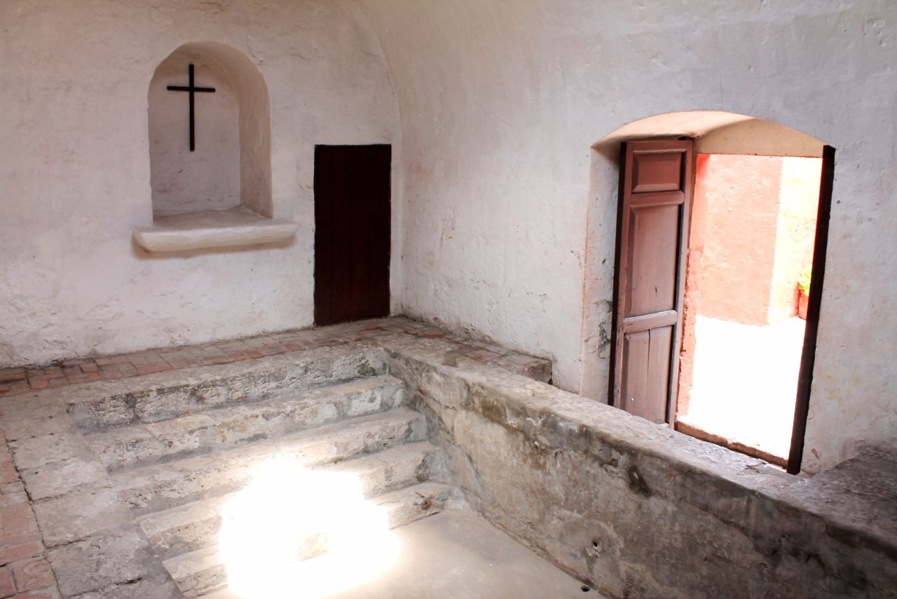Вход на территорию монастыря-музея с юго-восточного угла, около колокольни. Это улица Santa Catalina. Не путать с воротами на параллельной улице Bolivar, там тоже есть табличка с часами работы, но это как раз действующая часть монастыря.