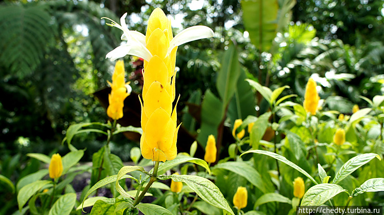 Купальня размещена в роскошном парке. Как называется все это цветущее великолепие я не знаю. Это точно не ромашки и не колокольчики, но они тоже очень красивые. Если серьезно, то Табакон один из лучших парков, которые я видел. Авторам прекрасно удалось совместить многочисленные потоки воды в каменистых руслах и роскошные цветущие кусты и деревья.