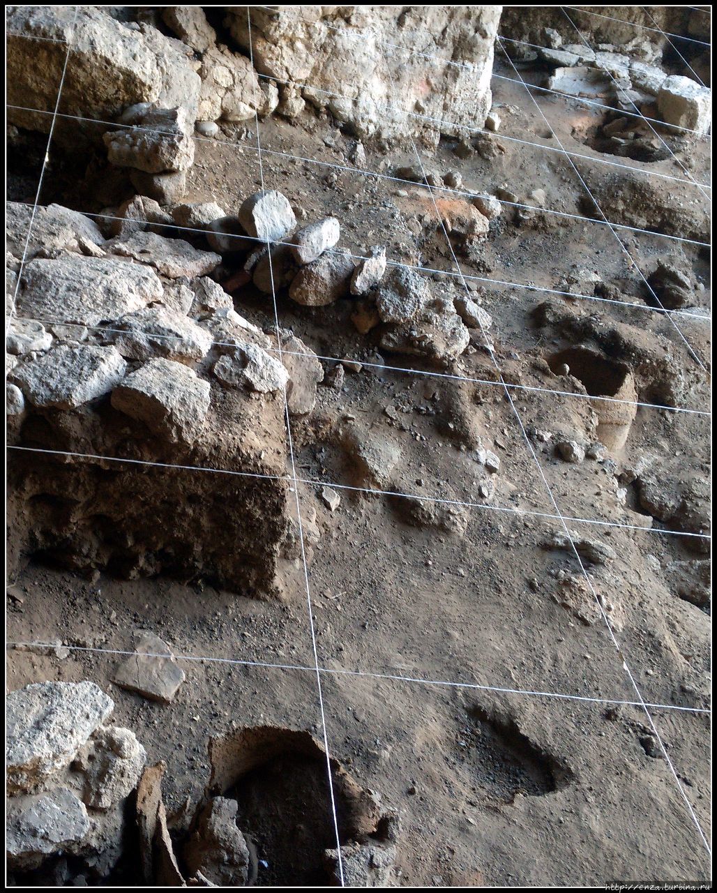 У входа в пещеру, на небольшой площадке размером примерно 85 кв.м, археологи обнаружили остатки двух жилых построек, относящихся к медно-каменному веку (4200-3500 гг. до н.э.). Сейчас расчищены остатки каменных стен одной из них, а также глинобитный пол. Тут же были обнаружены остатки весьма разнообразной по форме толстостенной керамики (горшков и котлов), а также более тонкой керамической посуды, которую условно можно назвать столовой (чашек, мисок, сосудов для воды). Кроме посуды здесь же были найдены несколько жаровен, плоский светильник с ручкой и округлый «чайничек» диаметром 5,4 см и высотой 5,7 см с носиком. Непосредственно под полом строений находится второй слой медно-каменного века, который датируют 3900-3800 гг. до н.э. Здесь также найдена кухонная и столовая керамика, в частности, горшки, крупные сосуды, миски.