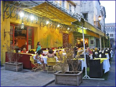 Даже не будучи Бог весть каким знатоком живописи, имя Ван Гога было известно и мне. Натолкнувшись на это интригующе-громкое имя во время выбора явок и паролей в Провансе, я стала что-то почитывать по этой теме. И к моей радости, в Арле, в городе, где предполагалось провести несколько ночей, обнаружилось кафе с идентичным названием. И с явно угадываемой связью с картинами известного художника.