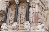 В левой стороне портала пять статуй изображают (слева направо) апостолов Варфоломея, Иакова Зеведеева, св. Трофима, апостолов Иоанна и Петра.