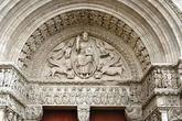 На верху, в тимпануме располагается Иисус Христос. Его правая рука поднята, а сам он окружен символическими изображениями евангелистов: львом (Марк), ангелом (Матвей), орлом (Иоанн), быком (Лука). Каждый из них держит книгу, а Иоанн – листок пергамента. Под Иисусом изображены 12 апостолов, также с книгами в руках, принимающим участие в Страшном Суде.