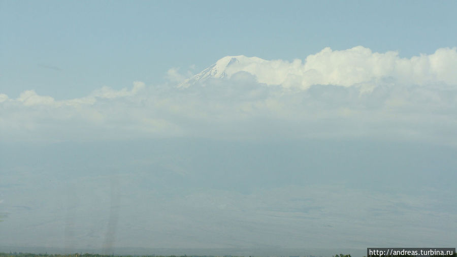 Автостопом отъехали от Еревана около 55 км до города Арарат. Справа от нас гора Большой Арарат, высота которой над уровнем моря составляет 5137 метров. Но сегодня нам не повезло — Арарат в облаках.