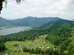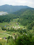 Со смотровой площадки на Тилан-ту открывается вид на Телецкое озеро, старый Артыбаш прямо под горой, поселок Иогач на другой стороне озера. Видно мост через Бию. А все это окружают волны гор, поросших кедрами и соснами.