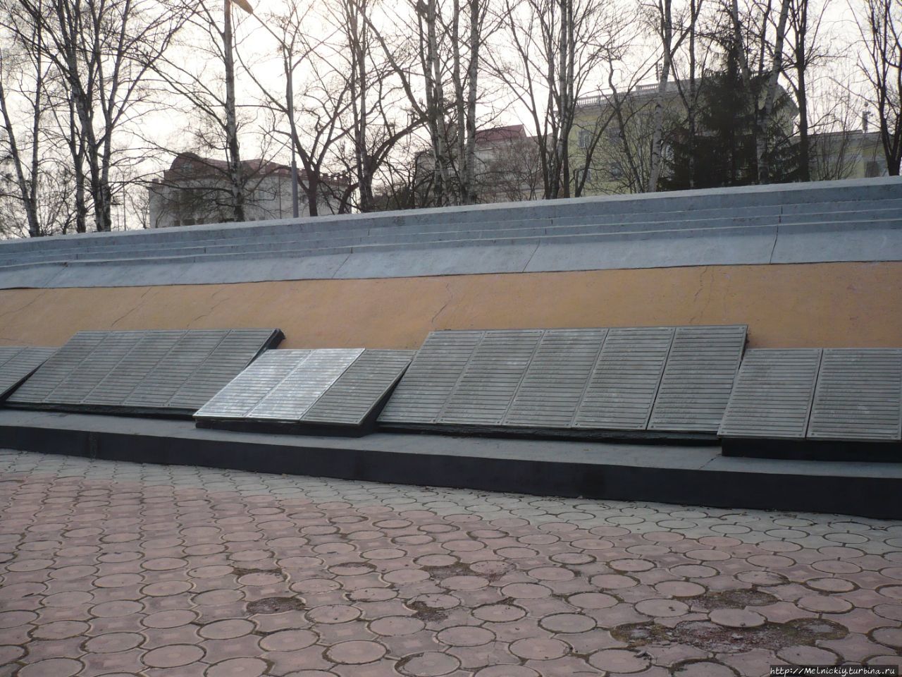 По бокам выложены мемориальные плиты. На них выбиты 1764 фамилии артемовцев, павших на поле брани и умерших в госпиталях от полученных ран.