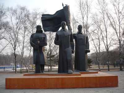 Дошел до развилки улиц Фрунзе и Кирова. Здесь в 1983 году установлен памятник Федору Андреевичу Сергееву (Артему). Революционер, активный участник революций 1905 и 1917 годов и Гражданской войны. В 1918 году основал и возглавил Донецко-Криворожскую Советскую республику. Трагически погиб в 1921 году при испытании аэровагона. Похоронен у Кремлевской стены в братской могиле.