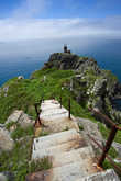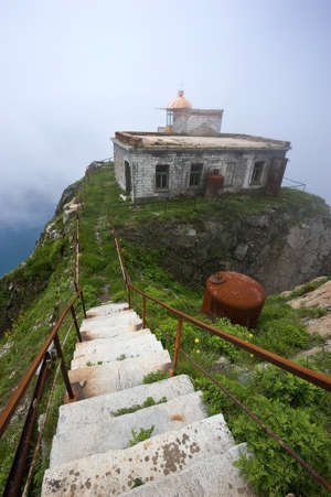 Так как мы шли впереди группы, то смогли спокойно поснимать пейзажи без толп народа в кадре. Постепенно туман стал приподниматься и периодически стал открываться старый маяк, который находится на скале много ниже. Ни я, ни мой попутчик не смогли удержаться, чтобы не попытаться спуститься по старой лестнице к маяку. И в прошлую мою поездку на Аскольд, и теперь большое впечатление произвела лестница вырубленная в граните. Состояние ступеней такое, будто их вырубали в прошлом году! Леерное ограждение почти везде сгнило, а плахи ступеней- как новые, хотя надо признаться, что кое-где лестница пришла в аварийное состояние и ходить надо очень аккуратно. Так периодически потрескивая затворами в разные стороны, мы спустились к тому месту, где раньше находился подвесной мост между утесами. В 90-е годы он сгорел, не знаю, что послужило тому причиной. Конечно, можно было аккуратно спуститься в расселину и затем подняться к старому маяку, но подоспевшие к тому времени наши попутчики активно принялись нас отговаривать от этой затеи, да и времени было не так уж много, а мы планировали еще поснимать на батарее, поэтому, я надеюсь, к старому маяку мы еще вернемся.