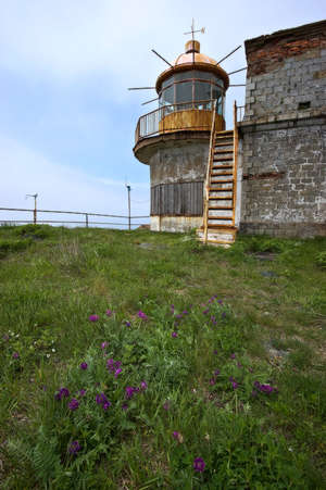 Было опасение, что при высадке на берег мы столкнемся с препятствием в виде арендаторов острова (в прошлом году такие прецеденты были), с этой целью все были вынуждены взять с собой паспорта, а я еще и удостоверение члена Русского географического общества взял с собой, но препятствий перед нами не возникло, и это не могло не обрадовать. Наскоро перекусили, немного поснимали аутентичную ржавчину погибших кораблей и по старой дороге двинулись в путь к маякам. Дорога идет под пологом леса и занимает минут сорок. Потом она выныривает на открытую местность и то тут, то там появляются развалины. Теперь-то я знаю, что это остатки городка артеллеристов, которые обслуживали батарею. Сразу за развалинами городка начинается территория, которая уже относится к маяку. Пройдя мимо работающей дизель-генераторной, мы вышли к самому маяку. С удивлением обнаружили, что за маяком и мысом Туманный светит солнце и синее небо!