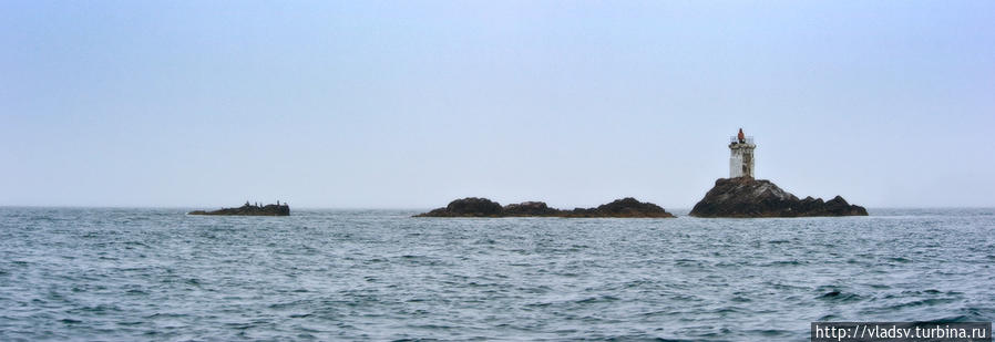 В надежде на жаркий, летний день на острове, я оделся, мягко говоря, легко, поэтому в море пришлось немного подрожать. Проходим камни Унковского. Так близко от них я прохожу впервые, раньше все больше приходилось наблюдать их издалека. Камни Унковского являются именно тем самым пятым пальцем одноименных кекур, которые мы видим со стороны Находки. На камнях большое лежбище тюленей-ларги, но погода не очень удачная для их съемки, да и чтобы хорошо поснимать животных нужно побыть там определенное время, чтобы они привыкли, а не делать это походя и на бегу, так что не судите строго за снимки.