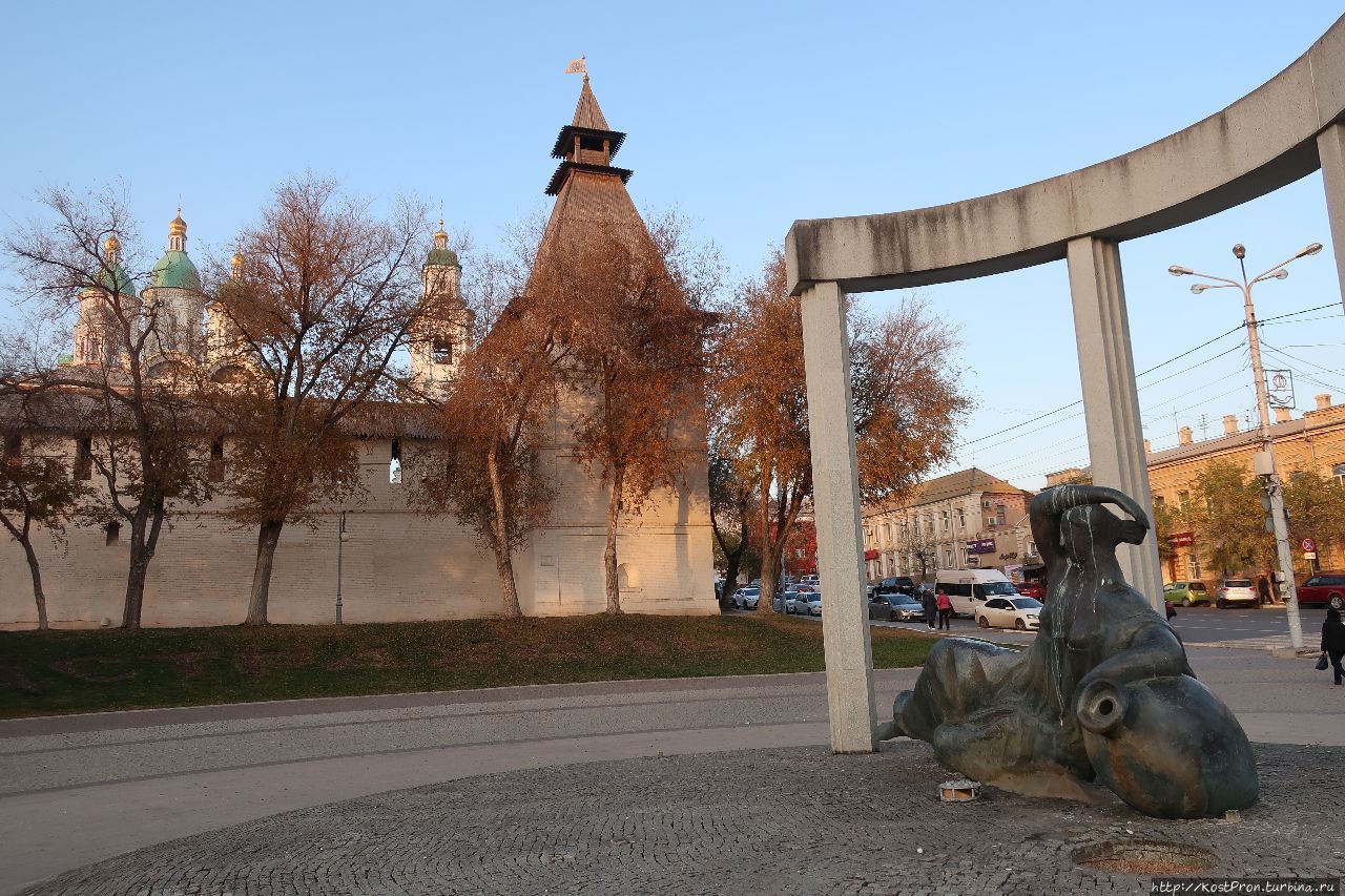 В непосредственной близости от Морского сада и монастыря расположен еще целый ряд интересных достопримечательностей. Вначале, как мне показалось, я наткнулся на памятник какому-то государственному и военному деятелю татаро-монгольского ига. Думал Чингисхан или, как минимум, Тамерлан. Подпись на постаменте ясности не прибавила: "Курмангазы". Пришлось опять лезть в интернет... Оказалось — казахский музыкант и поэт Курмангазы Сагырбайулы. Вероятно, личность широко известная в узких кругах — на его могиле в селе Алтынжар Астраханской области был построен целый мавзолей. А то, что я принял за короткое боевое копье, оказалось мирной домброй...