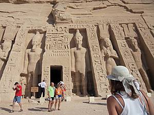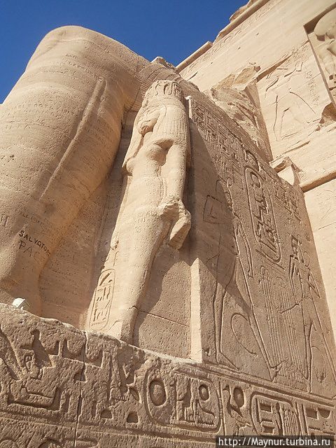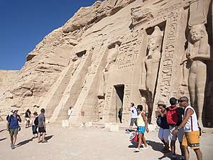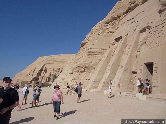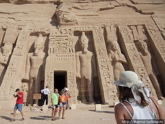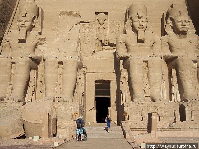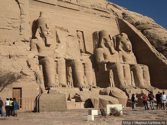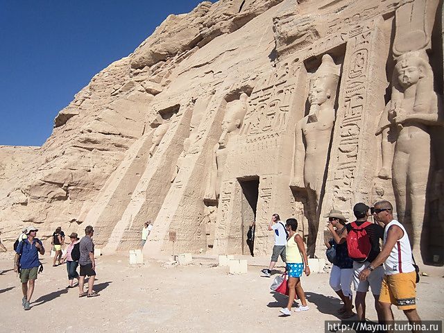 Большой храм , фараона Рамсеса Второго, и, малый , его жены Нефертари , были вырублены в скале в восьмом веке до н. э. Большой храм был сооружен в честь победы Рамсеса над хеттами. Войскам Рамсеса покровительствовали три бога- Амон, Ра и Птах. Рамсес приказал изобразить их и себя в фасадных статуях, причем боги должны были быть похожи на него. Так. на широкой террасе, у входа в храм появились четыре 20 метровых изваяния сидящего на троне фараона. У ног Рамсеса — скульптуры членов его многочисленной семьи- жена, мать и несколько детей, которых у него было более 200.