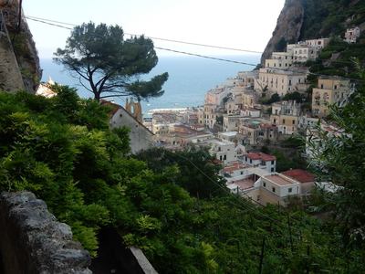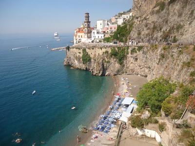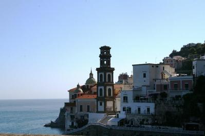 Город Atrani находится в узкой долине реки il fiume Dragone между двух скал. На западе скала monte Aureo на востоке скала monte Civita. На берегу на центральной площади расположена церковь chiesa Santa Maria Maddalena Penitente, первое здание которой было построено в 1274 году. Всего в историческом центре города расположено шесть средневековых церквей, построенных в разный период времени с десятого века до 17 ого века. Городской пляж песчаный и довольно широкий.