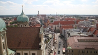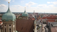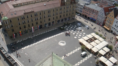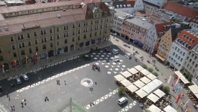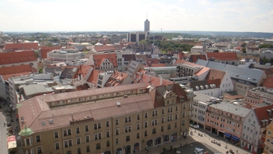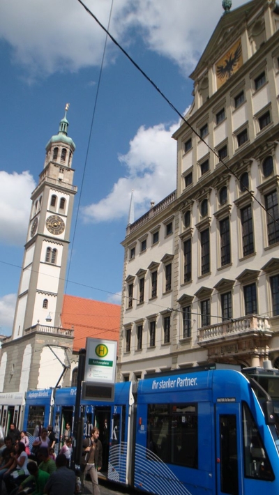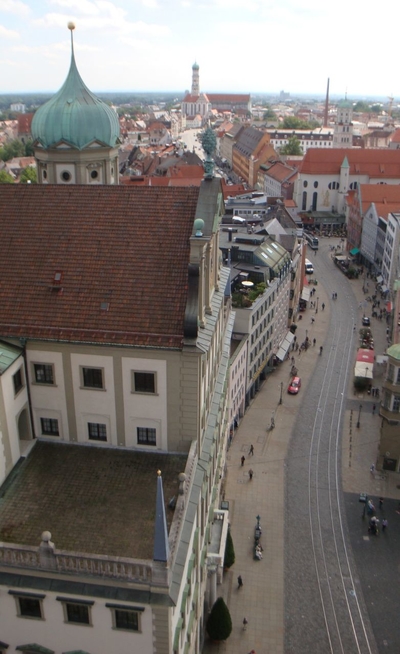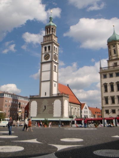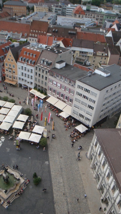 Семидесятиметровая башня на Ратушной площади, как и следовало ожидать, имеет лучшую в Аугсбурге смотровую площадку. Поэтому туристам надо обязательно на нее подняться, чтобы запечатлеть на фото и видео прекрасный город. Поднимаясь по лестнице, вы одновременно сможете ознакомиться с исторической экспозицией. Ведь башне – около тысячи лет. Когда-то она была дозорной, потом пожарной, а сейчас – символ Аугсбурга, великолепный архитектурный формирующий ансамбль Ратушной площади.