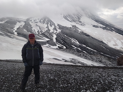 Уже изрядно замерзший, я успел запечатлеть себя на фоне Корякского вулкана.