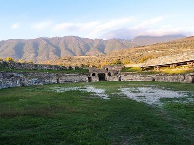 Амфитеатр похож на помпейский, хотя отреставрирован в меньшей степени. Зато с эстетической точки зрения сильно выигрывает из-за своего живописного расположения у подножия Апеннинских гор. Особенно хорошо эти древние стены смотрятся в естественной подсветке золотистых лучей заката.