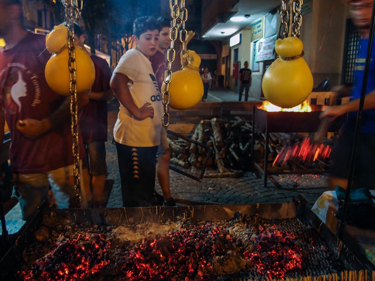 И только тогда заметили, что предпочитают есть местные жители. Самые большие очереди выстроились к мангалам, над которыми висели головки мягкого сыра качокавалло, который по форме напоминает каплю в светло-жёлтом парафиновом мешочке. Сыр чуть-чуть расплавляли над углями, потом подцепляли большим ножом и намазывали на большущий ломоть деревенского хлеба.