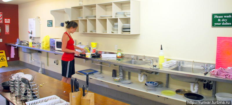 Во всех хостелах, как правило, есть большая гостиная с телевизором, холл или комната с Интернетом или WiFi, прачечная-автоматы с сушкой (3 AUD), кухня с газовыми или электрическими плитами со всем набором посуды, специй и продуктов Free (кем-то оставленных для других), полки и холодильники для своих продуктов. Так что в хостеле турист-одиночка никогда не будет голодным.