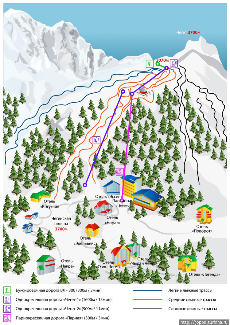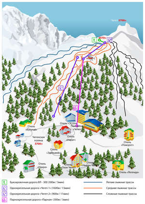 Пусть обилие цветных ниточек на схеме не сбивает вас с толку, на Чегете снега было реально мало и никакого простора для катания не наблюдалось.