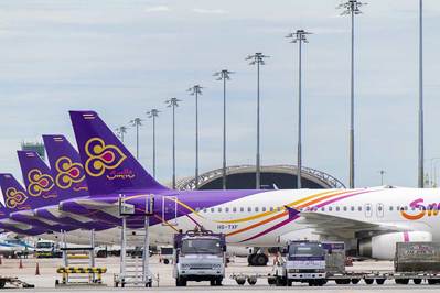 В назначенное время (7.35) пассажиров нашего рейса до Вьентьяна, проверив посадочные, отправили на 1-й этаж и стали выпускать на улицу для посадки в автобус. Выпускали порциями строго в соответствии с количеством сидячих мест в автобусе. Мы ехали мимо щупальцами раскинутого здания аэропорта, мимо самолетов различных авиакомпаний, имеющих свои логотипы на бортах самолетов. Каждый “рукав” был украшен портретом короля Таиланда со слоганом “Да здравствует король!”.