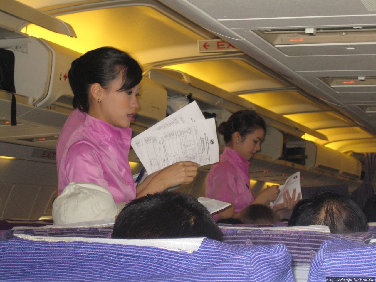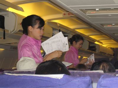 Фиолетовый хвост нашего Боинга 737-400 авиакомпании Тайские авиалинии был украшен золотой завитушкой с капелькой малинового цвета посредине. В салоне было 2 ряда по 3 кресла в каждом, и самолет оказался забитым под завязку. Пользуясь тем, что прошла первой, я сразу заняла место у окна (52А), и когда появились мужчина и женщина (мои соседи), я попросила их позволить мне остаться у окна, мотивируя желанием снять взлет и посадку. Соседями оказались лаосцы, проживающие и работающие в США. Они летели в месячный отпуск на Родину после тяжелого года работы поварами. Тяжелого, но, вероятно, прибыльного? Руки сидящей рядом со мной женщины были украшены всевозможными массивными браслетами и кольцами (похоже, золотыми), украшенными сапфирами и бриллиантами.