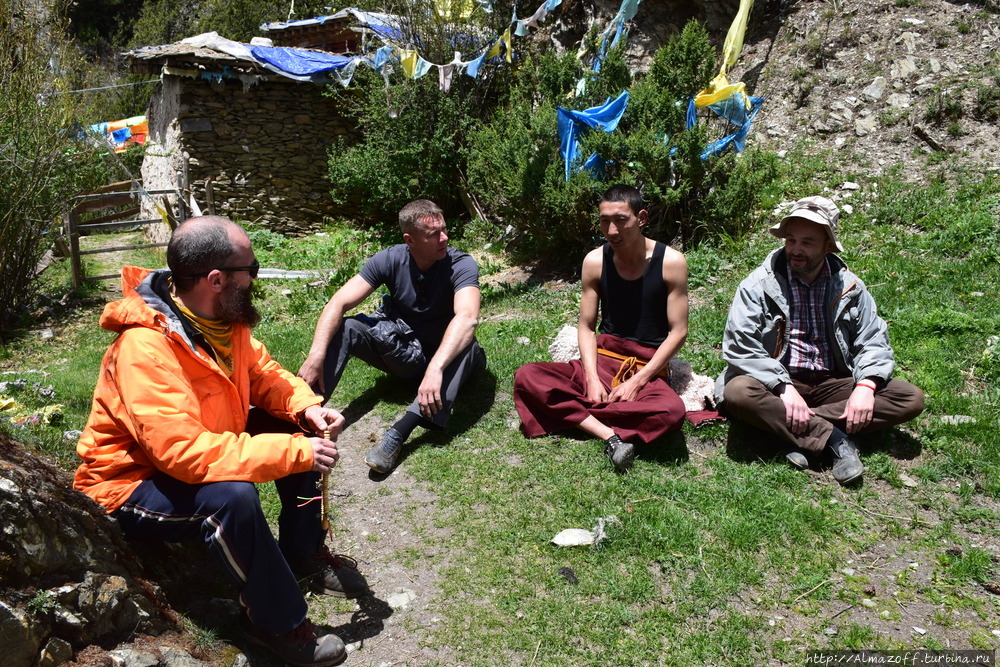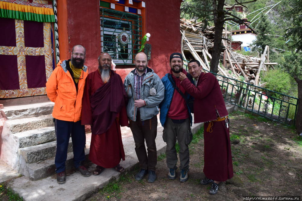 Зато намного выше монастыря нам удалось отыскать ретритный домик, в котором знаменитый 1-й Джамген Конгтрул Лодрё Тхае провёл в медитации 50 лет. Оригинальный дом разрушили китайцы, но сейчас дом восстановлен. Дом находится на территории ретритного центра Цадра Рингчен Драк, где помимо Джамгёна Конгтрула также медитировали другие мастера Риме. И Калу Ринпоче, один из первых учителей Ламы Оле и Ханны Нидал. Нам показали домик, в котором они все вместе собирались. Ретритный мастер (друпён) Лама Яргье оказался очень радушным тибетцем с бородой. Они с нашим Ником радостно дёргали друг-друга за бороды минут пять. Все смеялись. Друпён учился в Непале и Индии, наверняка участвовал в нападении на КИБИ в марте 1994-го, когда туда впервые привезли 17-го Кармапу Тхае Дордже. В ретритном центре в ретрите сидят 40 человек, у центра даже есть свои визитки на английском языке.
