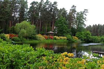Можно бесконечно бродить по аллеям этого парка-питомника... Но нужно обязательно подойти к самому колоритному месту — небольшому озеру, берега которого обсажены цветущими кустами.