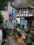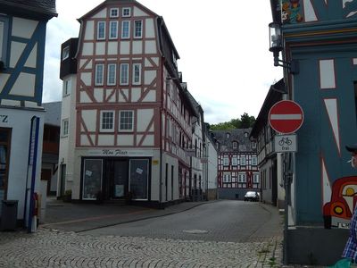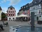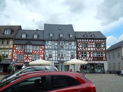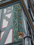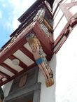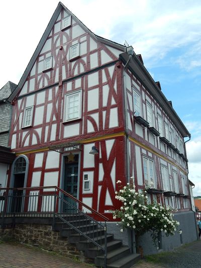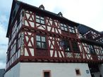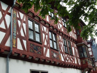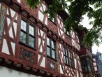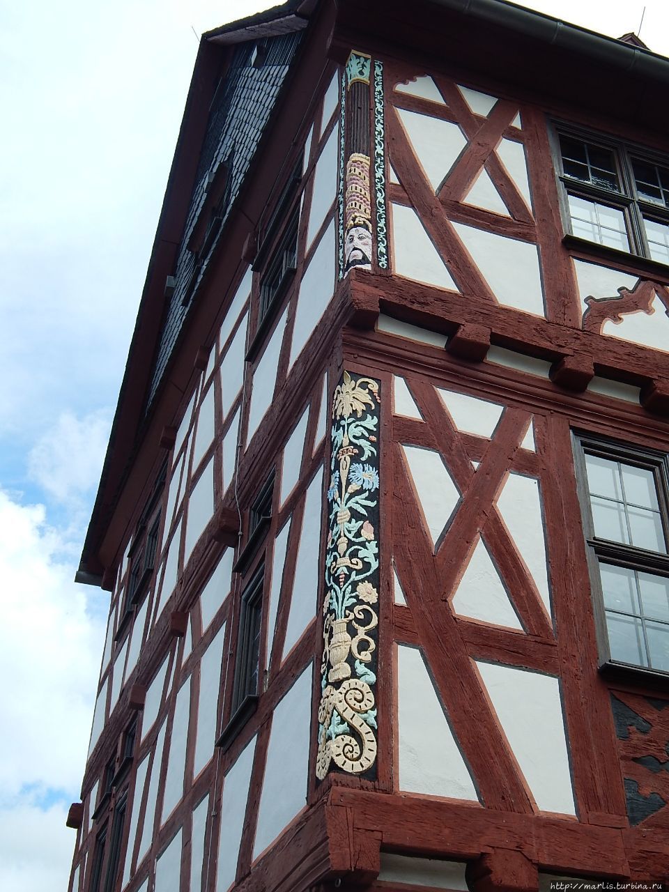 На Рыночной площади находится очень интересный фахверковый дом Садони. (Справа на фото) Кроме родового герба и человеческих фигурок, его украшают цитаты из Лютерской библии. Сделано это по приказу Нассауского казначея Ёхана фон Тифенбаха в 1592 году, проживавшего в этом доме. Задумайтесь! Ровно через 20 лет после Варфоломеевской ночи, протестант (гугенот) Тифенбах украшает свой дом цитатами из Лютера, живя в католическом Камберге!