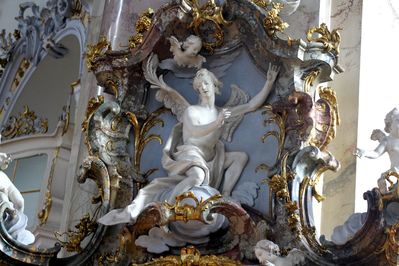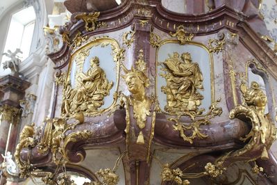 Спроектировал его по заказу Ноймана Й. Кюхель, а декоративную отделку, все эти прелестнейшие скульптуры святых и ангелов выполнили мастера Вессобрунской школы Ф.К.Фойхтмайер, И.М.Фойхтмайер и Й.Г.Юбельхёр. Автор фресок — Джузеппе Аппиани.