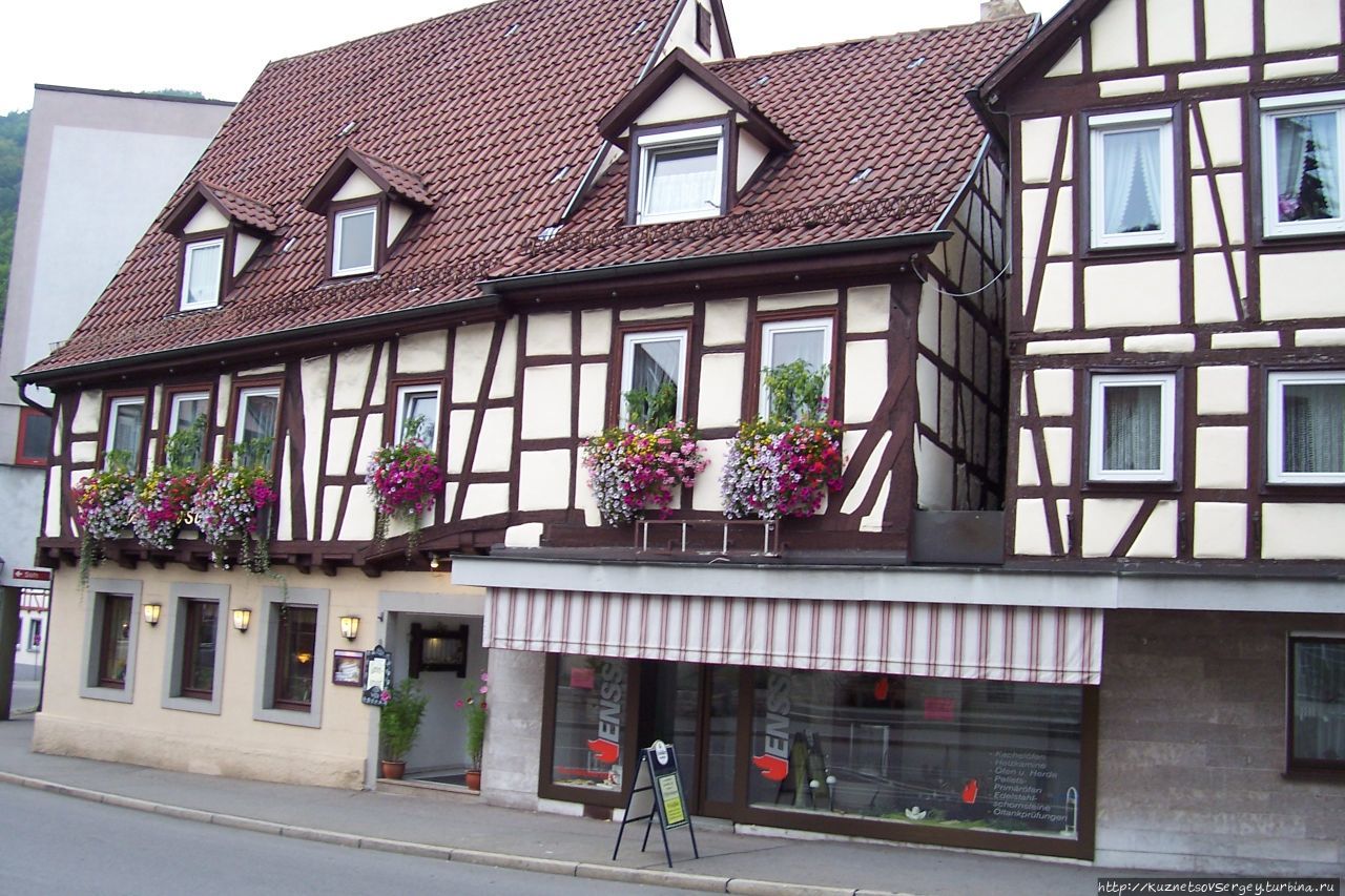 Эта часть Баден-Вюртемберга характеризуется холмистой местностью с довольно обширными равнинными пространствами. Но, когда мы стали приближаться к Бад-Ураху, дорога, неожиданно пошла под уклон и даже превратилась в серпантин. То есть мы спускались, как нам сначала показалось в ущелье, которое в заключение спуска тоже оказалось долиной. Уже дома я посмотрел по карте, и узнал, что та местность, где мы жили, находится на высоте около семисот метров, а Бад-Урах – на высоте четыреста метров.