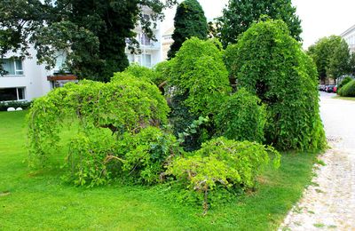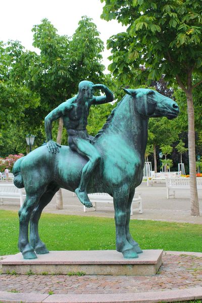 Добльхофпарк. Розы Бадена.). Хотя, и здесь есть на что посмотреть безусловно. И если Добльхоф — это размеренный отдых, любование цветами, общение с природой, то Курпарк — это как бы курорт люкс со всеми вытекающими в виде развлечений типа изящной еды, концертов классической музыки, азартных игр в казино и пряток от поклонников в колючих зарослях роз и плюща. А ещё бьющие струи прозрачной пахнущей минералами воды и ... пальмы, кругом пальмы. Это курорт-праздник! При входе сюда, признаться, хочется сменить бриджи на вечерний костюм, надеть туфли и накрасить губы. А ещё Курпарк — это тенистые аллеи и изящные изваяния.Пальмы... ощущение не просто курорта, но курорта южного. А они в кадках. Видимо, зимой укрывают, а то и вовсе уносят.