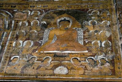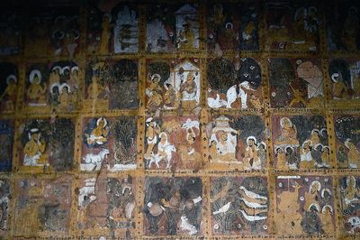 Интерьер храма освещается дневным светом, который проникает внутрь через большие перфорированные каменные окна. Первая комната от восточного входа содержит большое изображение Будды, сидящего на высоком постаменте. Изображение выполнено из камня и оштукатурено, а сам Будда сидит в позе «призывающего Землю в свидетели». Стена за Буддой и потолок над ним содержат хорошо сохранившиеся фрески с буддийскими изображениями, в других комнатах изображений Будды немного меньше.